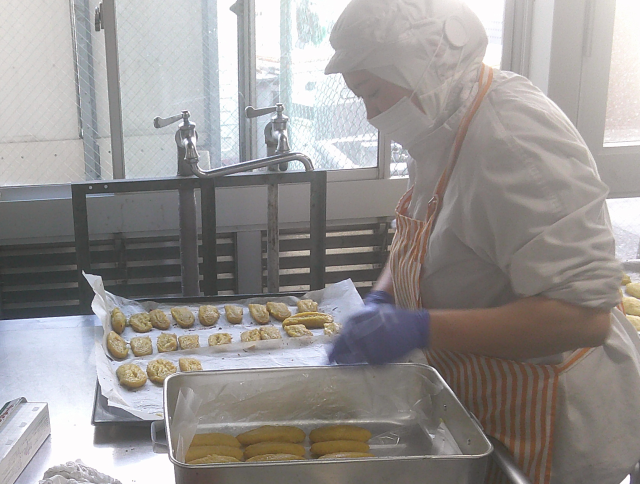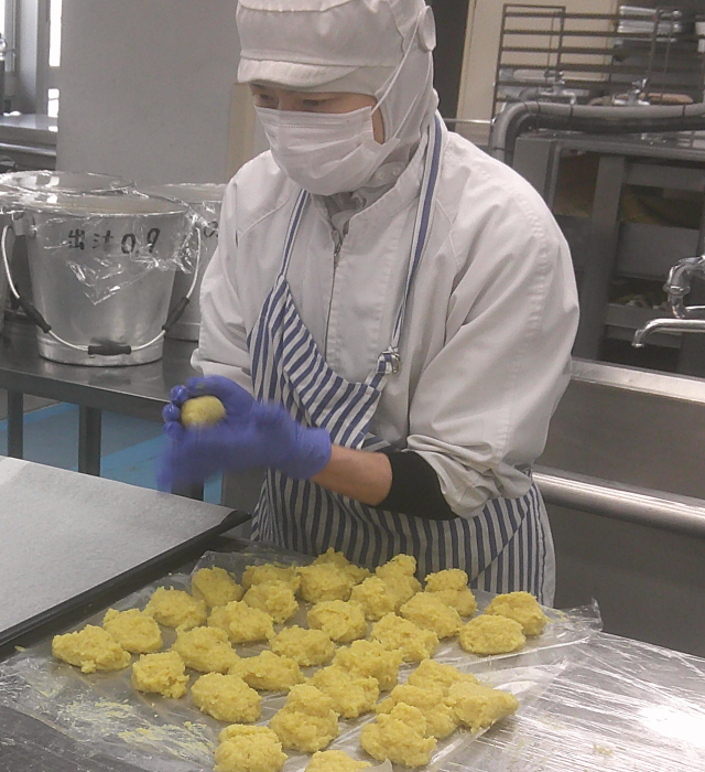 昔の給食「ソフト麺」の献立にしました。ソフト麺は、給食用に開発された麺だそうです。「ソフトスパゲッティ式めん」という名称でスパゲッティ風にもうどん風にも利用されたそうです。袋のまま温めて納品され、各自が袋を切って、スープの中に入れて食べます。スイートポテトは、さつまいもを蒸して、ラム酒・砂糖・豆乳を入れてミキサーでなめらかに混ぜ合わせ、楕円形に成形してオーブンで焼きました。「べにはるか」という甘い品種を使ったので、砂糖は予定の量の半分以下で甘い生地になりました。柔らかい芋だったので、やさしく丁寧に成形してくれました。甘くておいしいスイートポテトでした。今日もよく食べてくれました。