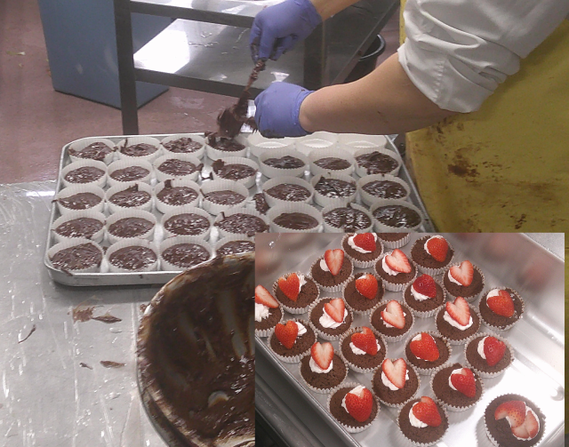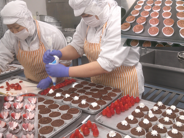 明日のバレンタインデーに合わせた献立です。ガトーショコラは、ココア・チョコレート入りの生地をカップに流し入れて焼きました。ホイップクリームを絞り出し、いちごをのせました。チョコレートの生地がおいしいデザートです。生地をよく冷ましてから、ホイップクリームといちごをのせるために朝早くから生地作りをしてくれました。チキンライスは、トマトピューレを入れて米を炊き、鶏肉や野菜をいためてケチャップ等で味をつけた具と混ぜ合わせました。グリーンサラダは、キャベツ・きゅうり・さやいんげんを茹でてから流水で冷やし、直前にドレッシングと合わせました。さっぱりと食べられます。今日もよく食べてくれました。