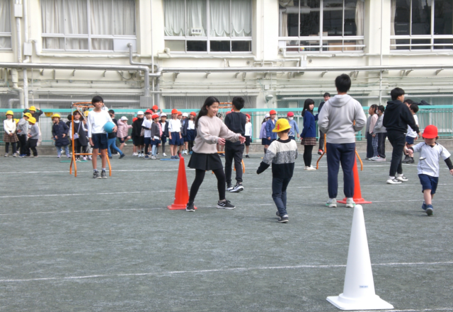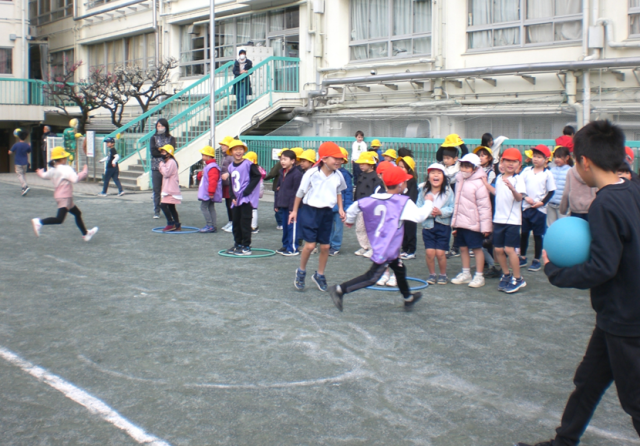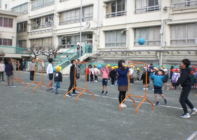 火曜日は1年生の番で、4チームに分かれ、最初にボールをシュート、次に6年生とじゃんけん、その次はオタマでピンポン玉運びをして、最後は全力で走って戻ります。