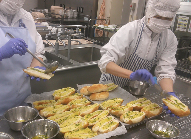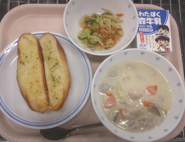 シュクメルリはジョージア料理です。「にんにくをおいしく食べる料理」と言われているそうです。にんにくを炒めて香りを出してから、たまねぎ・鶏ガラでとったスープを入れて煮、ガーリックパウダー・塩・こしょうで下味をつけた鶏肉・蒸したさつまいもを入れ、牛乳・豆乳と手作りのホワイトルウを入れて煮ました。塩・黒コショウで味をつけ、ピザ用チーズを入れて仕上げました。にんにくの香りはかなり控えめにしました。ホワイトルウとチーズのクリーミーさがおいしい煮込み料理です。ガーリックトーストは、人気のトースト料理です。ソフトフランスパンに切れ目を入れ、断面にオリーブ油・にんにく・きざんだパセリを合わせたものを塗り、オーブンで焼きました。にんにくの香りがおいしいトーストです。大豆とじゃこのサラダは、大豆は片栗粉をまぶしてオーブンで焼いて冷まし、茹でて冷やした野菜(キャベツ・きゅうり・にんじん)と合わせました。乾煎りしたちりめんじゃこを仕上げに入れました。焼いた大豆が香ばしいサラダです。今日もよく食べてくれました。
