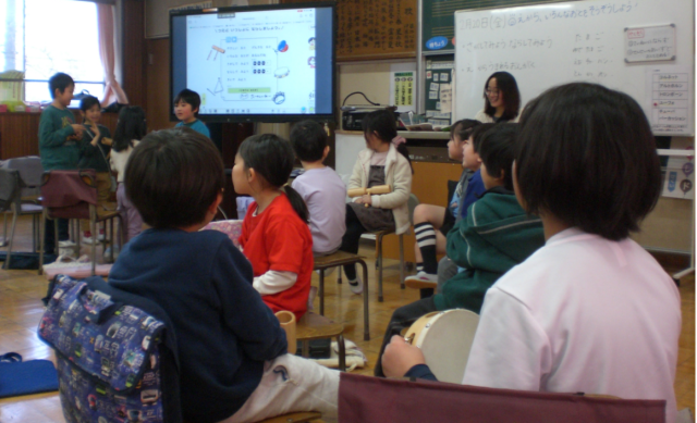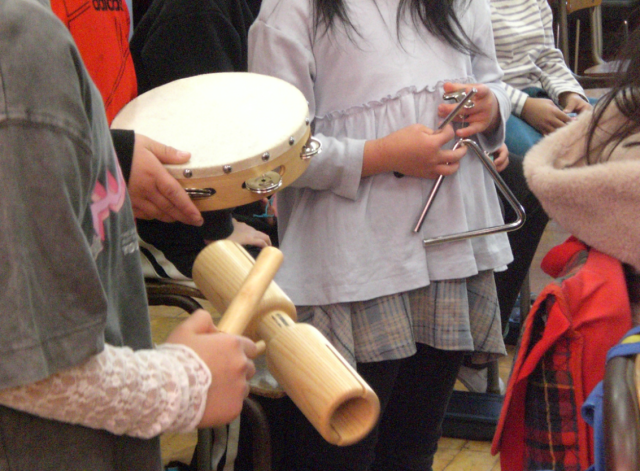 4人ずつのクループに分かれ、ウッドブロック、タンバリン、鈴、トライアングル、カスタネットの中から
