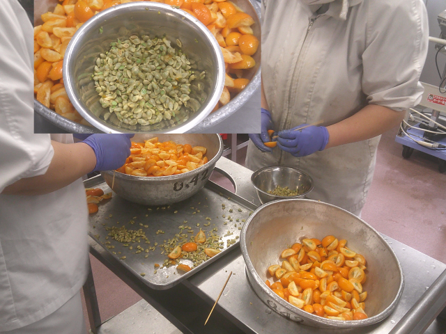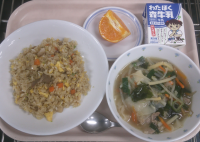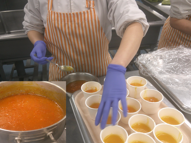 えびといかのチリソースは、油でにんにく・しょうが・ねぎを炒め、だし汁・砂糖・しょうゆ・トマトケチャップ等を煮てかたくり粉でとろみをつけ、下味をつけてからかたくり粉をまぶして油で揚げたえび・いかを入れて煮込み、ニラを入れて仕上げました。辛みはチリパウダーとタバスコでつけましたが、控えめにしました。ごはんにかけて丼にしました。甘辛いソースとごはんがよく合います。糸寒天の中華風サラダは、糸寒天をさっと茹でて冷やしドレッシングの一部で味をつけてから、きゅうり・もやし・にんじんとドレッシングと合わせました。糸寒天の歯ごたえが楽しい、さっぱりとしたサラダです。金柑ゼリーは、新メニューです。オレンジゼリーの液に金柑をきざんだものを入れて煮、冷やし固めた後に金柑と砂糖で作ったジャムをかけました。金柑は、丁寧に種を取り除いてから皮ごと使いました。金柑の甘さとほろ苦さがおいしいゼリーでした。今日もよく食べてくれました。