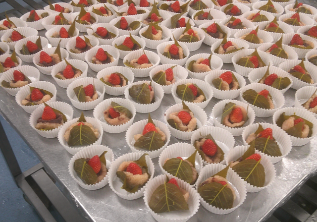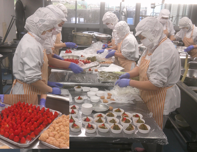 明日が青空班給食なので、一日早いひな祭り献立です。すし酢を作り、固めに炊いたご飯にかけてすし飯にし、凍り豆腐や鶏肉等を煮た具と混ぜ合わせ、炒り卵・花形にんじんで飾り付けました。すまし汁は、豆腐・えのきたけ・わかめ・糸三つ葉を入れました。だしのうま味がきいています。いちご桜餅は、手作りの道明寺の桜餅です。道明寺粉にビーツの缶詰をピューレ状にして混ぜて赤く染め、蒸してから分割して丸めて伸ばし、いちごをのせた小豆あんを包み、桜の葉の塩漬けで包みました。手間と時間のかかる作業でしたが、調理員さんが愛情込めて一生懸命作ってくれました。小豆の甘さと、桜の葉の香りが馴染んだとてもおいしい桜餅でした。今日もよく食べてくれました。