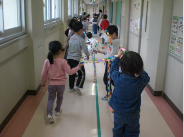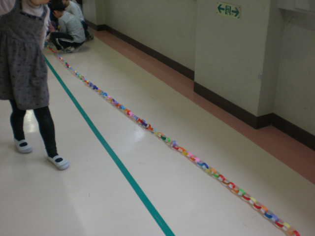 輪飾りは、クラス全員の分をつなげると、1年生の教室から音楽室まで届く長さになりました。