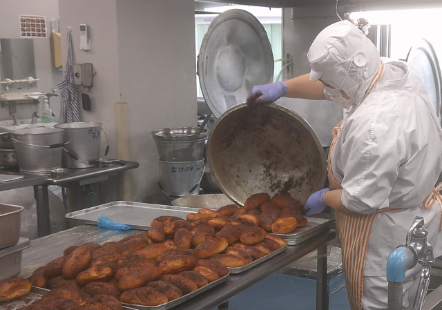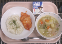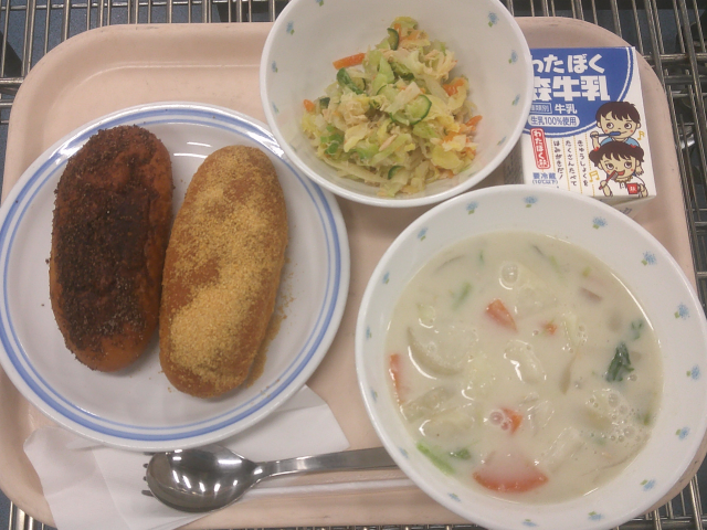 給食の定番「揚げパン」の献立です。今回はきなことココアの2種類の揚げパンを作りました。きな粉と砂糖を合わせたもの・ピュアココアとグラニュー糖を合わせたものを用意し、油でさっと揚げたパンにまぶしました。きな粉のコクと砂糖の甘さ、ココアのほろ苦さと砂糖の甘さを感じます。手が汚れないように、紙ナフキンをつけました。豆乳ホワイトシチューは、牛乳を使わず豆乳だけを入れたシチューです。上新粉(米粉)でとろみをつけたスープにしました。鶏肉・たまねぎ・にんじん・じゃがいも・かぶ・かぶの葉を入れました。小麦粉と油・バターで炒めたルウを入れないため、さっぱりとしたシチューです。サラダは、白菜・キャベツ・きゅうり・にんじんを茹でて冷やしツナ缶と合わせ、レモン汁を入れたドレッシングと直前に混ぜ合わせました。さっぱりとした味にツナのうま味が効いたサラダです。揚げパンは大人気でした。今日もよく食べてくれました。