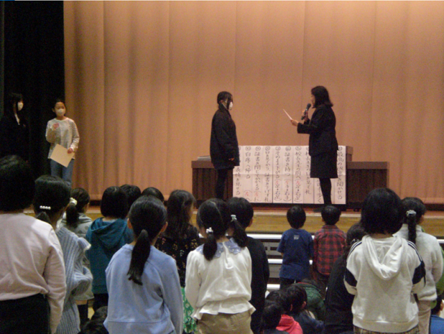 今日の昼会では、「めぐろの子どもたち展」と「東京都公立学校美術展」に、図工や書写等の作品を出展した児童の表彰を行いました。