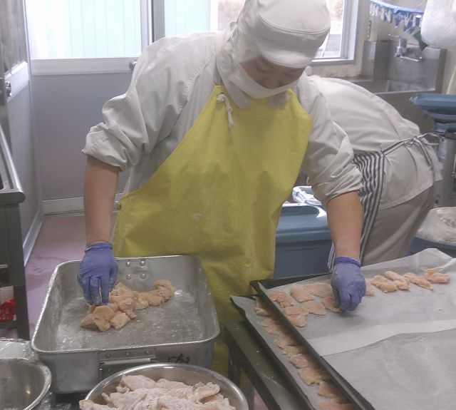 ガーリックライスは、オリーブ油・にんにく・塩を入れて米を炊きました。ドライパセリをかけて彩良くしました。バッファローチキンは、鶏肉に片栗粉をまぶして油をつけ、スチームコンベクションオーブンで焼きました。ケチャップやタバスコを煮込んだソースをからめました。手羽元を揚げて作ることが多いそうですが、今回は胸肉の切身を使い焼きました。ケチャップの甘さとにんにくの香り、ほんのりつけた辛みが後を引くおいしさです。薄い切身を1人2個づけにしました。ポトフは、鶏肉・たまねぎ・にんじん・じゃがいも・キャベツかぶ・かぶの葉を、鶏がらでとったスープで煮ました。今日もよく食べてくれました。