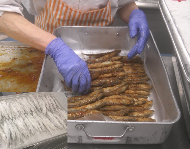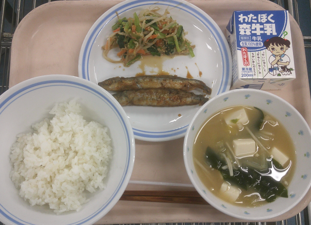 小魚を使った献立です。みそ汁は白菜・豆腐・えのきたけ・わかめの具です。カットわかめは今日も気仙沼産です。だしのうま味と、やわらかく煮た白菜の甘みがおいしいです。ししゃもにかたくり粉をつけ、油でカラッと揚げてから、しょうゆ・砂糖などを合わせたたれをからめました。頭からしっぽまで抵抗なく食べられます。骨も気にならずに食べられました。ごまあえは、小松菜・もやし・にんじんを茹でて冷やし、練りごま・しょうゆ等を合わせたたれと合わせました。ごまのコクがおいしいあえ物です。一汁二菜の和食献立です。今日もよく食べてくれました。
