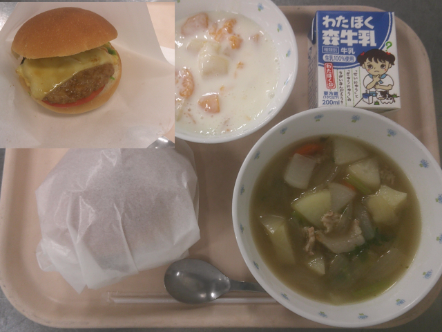 手作りのハンバーガーの献立です。駒場バーガーは、手作りのハンバーグを作り、てりやきソースを作り、ハンバーグが熱いうちにソースをかけ、スライスチーズをのせてもう一度軽く焼き、茹でたキャベツ・輪切りにしたトマト・ピクルスを混ぜたマヨネーズタイプのました。ハンバーグのうま味とチーズのコクがおいしいバーガーです。色々な具と味つけがオリジナルということで、「駒場バーガー」と名付けました。野菜スープは、豚骨でとったスープで炒めた豚肉と野菜を煮ました。野菜の甘さが効いたスープです。フルーツヨーグルトは缶詰のフルーツとヨーグルトを合わせました。明日がホワイトデーということで白いデザートにしました。今日もよく食べてくれました。