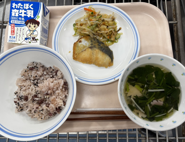 6年生の卒業をお祝いする赤飯の献立です。赤飯は、茹でた小豆とゆで汁も入れて米・もち米を炊き、炊きあがったら黒ごまを混ぜました。塩は、米を炊くときに入れて全体に味が付くようにしました。精白米ともち米を21の割合で入れたので、炊飯器でおいしく赤飯ができます。すまし汁は、桜の花びらの形をしたかまぼこを入れました。桃色のものとオレンジ色のかまぼこを入れました。絹ごし豆腐・ほうれん草・えのきたけも入れました。大豆サラダは、大豆を茹でてかたくり粉と油をまぶしてオーブンで焼き、茹でて冷やしたキャベツ・きゅうり・にんじんと、長ねぎ入りのドレッシングと合わせました。大豆を揚げることで、豆の苦手な児童も食べやすくなります。一汁二菜の和食献立です。今日もよく食べてくれました。