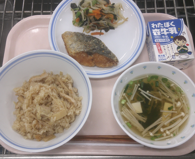 目黒区はかつて竹林があり、たけのこを栽培していたそうです。生のたけのこを、皮ごと米ぬか・米のとぎ汁・唐辛子を入れて茹でてあく抜きをし、水洗いしながら皮をむき、細かく刻んでから油揚げとだし汁としょうゆ・みりん・酒で煮て炊けたごはんと混ぜました。米を炊く水にもだし汁やしょうゆ等で味をつけたのでうま味が米までしみています。すまし汁は、豆腐・えのき・わかめ・小ねぎの具です。わかめは、気仙沼産です。さわらは春の魚です。しょうが・しょうゆで下味をつけてかたくり粉をまぶしてカラッと揚げました。磯香あえは、おひたしにきざんだ焼きのりを合わせました。海苔の香りがおいしいあえ物です。今日もよく食べてくれました。