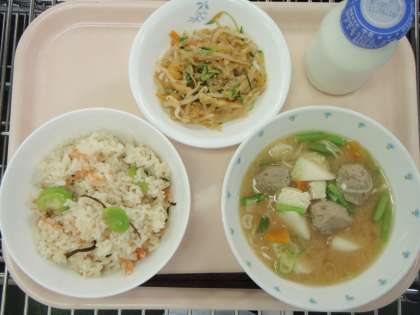6月8日 桜エビとそらまめのごはん 駿河汁 糸寒天のごま酢あえ 牛乳
