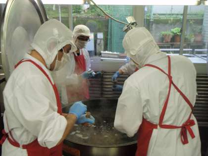 今日は旬の桜エビとそらまめをごはんに炊き込みました。この料理は、先月に友達と食事に行った際に、季節を感じることができるごはんだったことから、給食に取り入れようと思いました。桜エビは駿河湾産の釜揚げ桜エビをたっぷりつかいました。そらまめはゆでて、薄皮を調理師さんが一つ一つ丁寧にむいてくれました。ごはんが炊きあがり、炊飯器のふたを開けた瞬間にとてもよい香りがし、ピンク色がとてもきれいでした。食べやすいよう、塩昆布とごまも混ぜました。大人には大好評で、子どもたちの中には「おいしい!山盛りにして!」という子もいましたが、「桜エビが苦手・・。」「そらまめが嫌い。」という子もいて、少し残ってしまったのが残念でした。