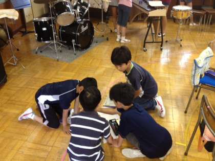 グループに分かれて、何の楽器を使おうか、誰が担当するか、またメロディーの組み合わせは?と、いろいろ話し合いながら進めています。