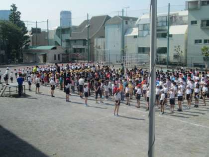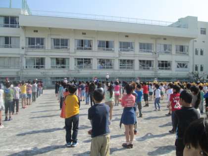 体育朝会では、ラジオ体操を行いました。体育委員会の児童が前に立ちお手本となってくれていたので、1年生も分からないながらに見よう見まねで一生懸命に行っていました。運動会が楽しみになってきました。