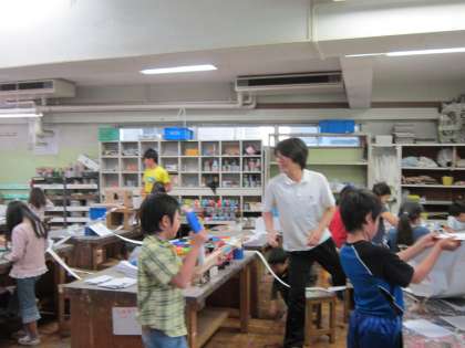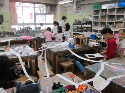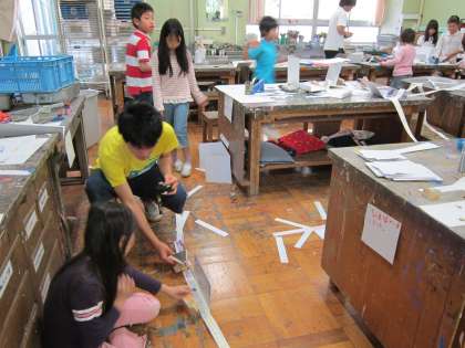 「線路は続くよどこまでも」と題して線路と駅・電車を作成しています。廊下を歩いていたら「校長先生」と呼び止めてもらい手作りの電車を貸してもらいました。図工室の中は、線路でいっぱい。電車を持ち、学級みんなで作った線路の上を思い切りスピードを出して走りました。おもしろい名前の駅がたくさんありました。子どもたちも、金子先生も楽しそうです。