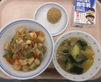 今日は愛知県の郷土料理であるきしめんを作りました。味噌煮込みうどんも有名なので、今日は八丁味噌味のきしめんにしました。きしめんは普通のうどんよりも幅が広く、食感がつるつるしています。汁は残ってしまいましたが、麺はよく食べてくれていました。手羽先揚げは、手羽先にでんぷんをまぶしてじっくり油で揚げて、あまからいたれとゴマをからめました。たれは、こしょうとにんにくの味がポイントです。「手羽先、もっと食べたい!」という子もたくさんいましたが、「手が汚れるのでいやだ。」という子や1年生の中には食べたことがない子もいたようでした。