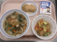 今日は4年生のリクエスト給食でもあり、懐かしの給食メニューの日でした。昭和51年ごろの目黒区では、あげパン、ワンタンスープ、くだもの、牛乳という組み合わせの給食が出ていました。リクエストでもよくでるメニューなので、昔も人気があったメニューだったかもしれません。今日は、海藻サラダをプラスして、デザートをフルーツポンチにしました。4年生は「ミルフィーユが食べたかった!」「ティラミスは?」と自分が書いたメニューが選ばれなかったことを残念そうに言っている子もいました。ミルフィーユは4年1組の子がたくさん書いてくれていたので、12月の献立に入れようと思っています。j今日はどのクラスも残さず食べていました。