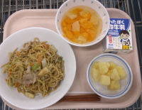 夏休み明け最初のメニューはカレーライスでした。給食では色々なカレーがありますが、今日はタマネギ、人参、じゃがいも、いんげんが入ったポークカレーを作りました。海藻サラダはさっぱりした味つけにしているので、カレーと良く合い、最後まで美味しく食べることができます。