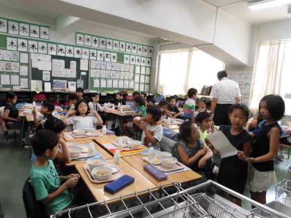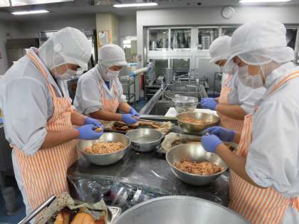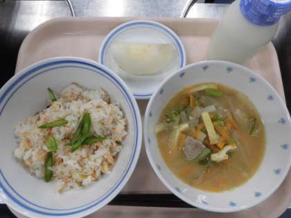 今日は重陽の節句にちなみ、鮭ずしに菊を入れました。菊の花はさっとゆでて寿司酢につけておき、焼いてほぐした鮭といっしょにご飯に混ぜました。鮭は調理師さんが骨を丁寧に取り除いてくれ、皮もおいしく食べることができるように皮だけさらに焼いてくれました。とても上品な味でおいしかったですが、クラスによっては少し残ってしまいました。呉汁にはごぼう、大根、ニンジンなどのほかにゆでてつぶした大豆や豚肉も入っていて栄養満点です。くだものは旬のナシでした。さっぱりとしておいしく、大人気でした。