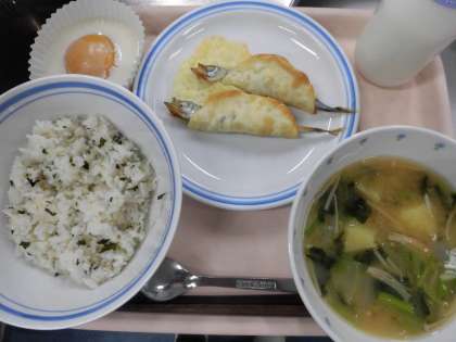9月14日 わかめごはん みそしる ししゃもぎょうざ おかしな目玉焼き 牛乳
