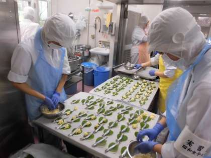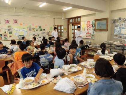 今日はカルシウム強化メニューということで、栄養士の実習生が考えた献立を実施しました。みそ汁には小松菜を入れ、ししゃもぎょうざにはチーズと大葉を1枚ずつ包んでオーブンで焼きました。大葉の水分を丁寧にとり、チーズがはみ出ないように包むのに時間がかかり、提供時間が少し遅れてしまいましたが、いつものししゃもよりは食べやすかったのか、思ったよりよく食べてくれていました。ただ、やはりししゃもは苦手という子や、大葉が苦手という子もけっこういました。おかしな目玉焼きは、豆乳と牛乳を半分ずつ使用して作りました。今回は寒天の量を減らしたので、固くなりすぎずおいしくできました。