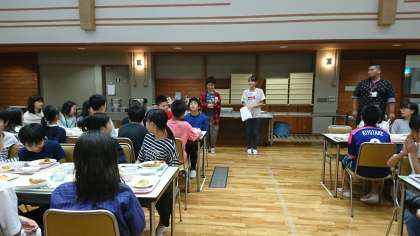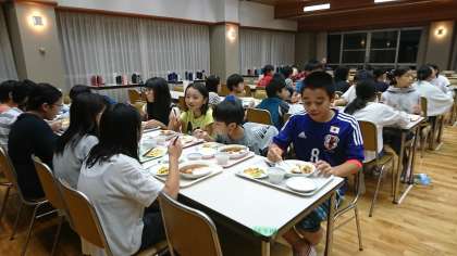 開園式の後、部屋に入り、避難経路を確認して入浴。そして、夕食です。メインはカレーライス、いただきますから5分すると、おかわりの行列ができました。