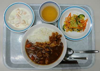 ご飯、チキンカレー、福神漬け、コールスローサラダ、フルーツヨーグルト和え