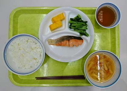 ご飯、鮭の塩焼き、卵焼き、小松菜のソテー、具だくさんの味噌汁
