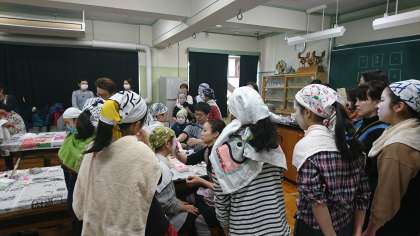 3月5日、PTA卒業対策委員の皆さんの企画の『歌舞伎メイクをしよう』の体験学習があり、日本の伝統文化である歌舞伎の隈取を実際に体験しました。