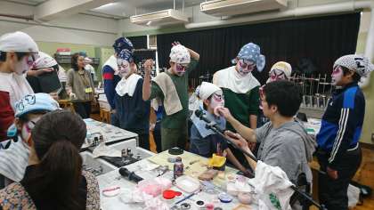 メイクが完成して顔拓を取ったら記念写真。とても貴重な経験となりました。企画から当日のサポートまで、保護者の皆様にはお世話になりました。ありがとうございました。