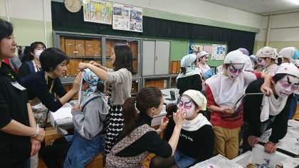 講師の方に下地作りをしていただき、その後、一人一人が教えていただきながら自分でメイクをしました。歌舞伎や化粧の由来、隈取の意味など講師に教えていただきながら楽しく活動できました。