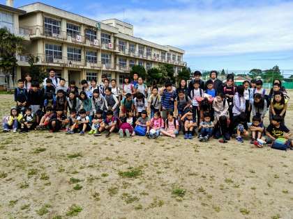 給食後は大島小学校の広い校庭で、学年全員で集合写真を撮影しました。