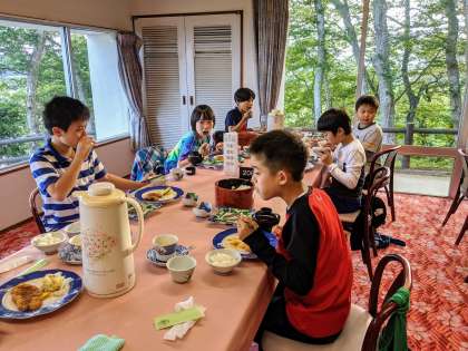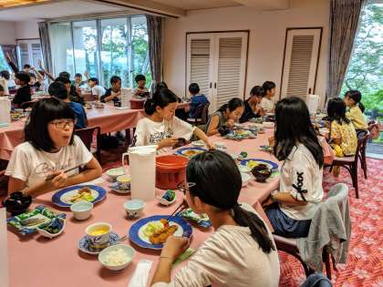 充実した1日を過ごして、みんな食が進んで、しっかりといただきました。夜は再び大島小学校に向かい、大島の崎浜美和太鼓体験です。