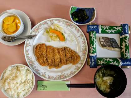 ○とんかつ、温野菜、さわら西京焼き、わかめときゅうりの和え物
