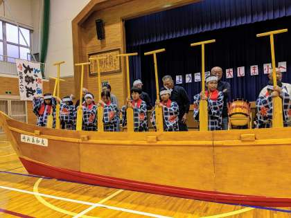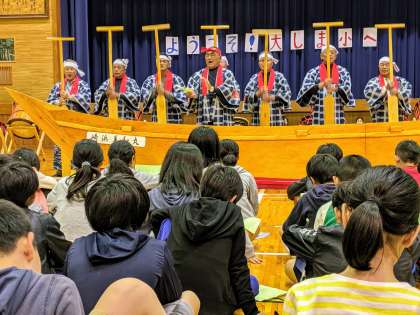 今年の5年生は、唄いに合わせて大きな櫂で拍子をとる体験をさせていただきました。