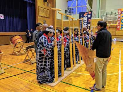 2日目夜の活動は、再び大島小学校の体育館アリーナでの伝統芸能体験でした。