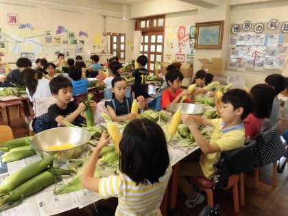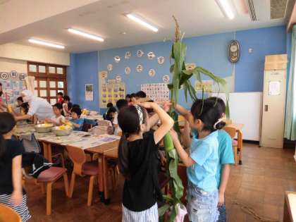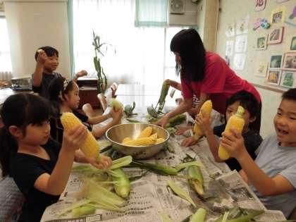 今日は2年2組の子どもたちととうもろこしの皮むきをしました。「23枚もあったよ!」「とうもろこしの水が飛んだ!」「ひげがもしゃもしゃで気持ちいい!」と楽しみながらやることができました。実際のとうもろこしがなっている木を見て、背くらべをしたり、「葉っぱが大きい!」と観察したりしました。