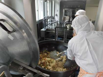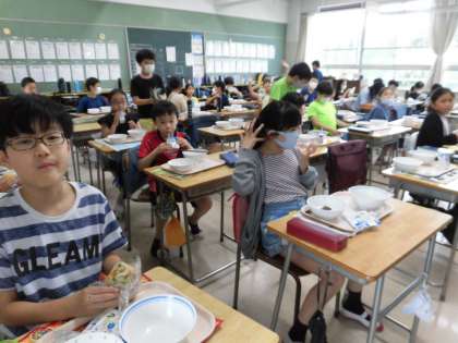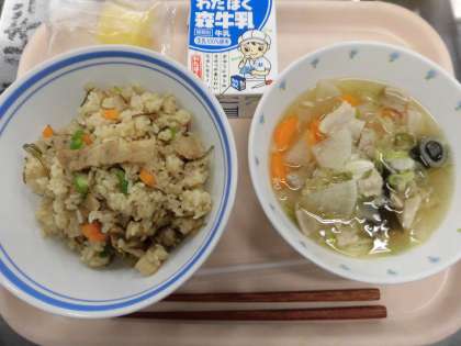今日は沖縄県の郷土料理を作りました。クファジューシーは豚肉や海藻を炊き込んだごはんです。今日は、厚切りの豚バラ肉をゆでた汁にかつお節を入れてだしをとり、炊き込みました。ジューシーの具は、豚バラ肉と切りこんぶ、にんじん、インゲンを入れました。ソーキ汁は、本来は骨付きの豚バラ肉を使いますが、今日は骨なしの豚バラ肉で作りました。結び昆布やダイコンなどを入れて作るのが特徴です。結び昆布が柔らかくなりすぎないよう別に煮ましたが、結び昆布は苦手な子が多かったようで少し残ってしまいました。冷凍パインは2回目の登場です。沖縄県の石垣島から届けてもらいました。