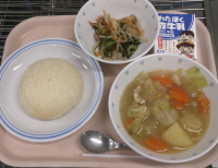 今日は旬のカツオをごまみそいためにしました。角切りのカツオにしょうゆやショウガで下味をつけ、片栗粉をまぶして油であげ、甘辛いみそだれとごまで和えて炒めました。しっかりした味なので、白いご飯によく合っていました。1,2年生では、最初は「これ何?」と食べるのをためらう様子もありましたが、一口食べると「おいしい!」と残さず食べてくれる子がたくさんいました。