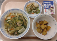 今日はジャガイモを蒸してつぶしたものを炒めた玉ねぎ、ひき肉、にんじんを合わせたポテトミートサンドを作りました。コロッケの具のようなものなので、子どもたちも「おいしい!」とよく食べてくれていました。秋野菜のクリームスープには、サツマイモやシメジ、カブを入れました。カブは西東京市の田倉農園さんでとれたもので、葉っぱもとても立派なものが届きました。カブとサツマイモが崩れないよう、調理師さんが2釜に分けて作ってくれました。カブが苦手、しめじが苦手、という子もいましたが、全体的にはよく食べてくれていました。