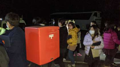 19時35分、ロビーに集合。玄関前のポストに書いたハガキを投函して、星空観察会です。
