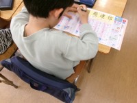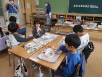 今日から1年生の給食が始まりました。フィッシュバーガーは、丸パンに切れ目を入れ、...