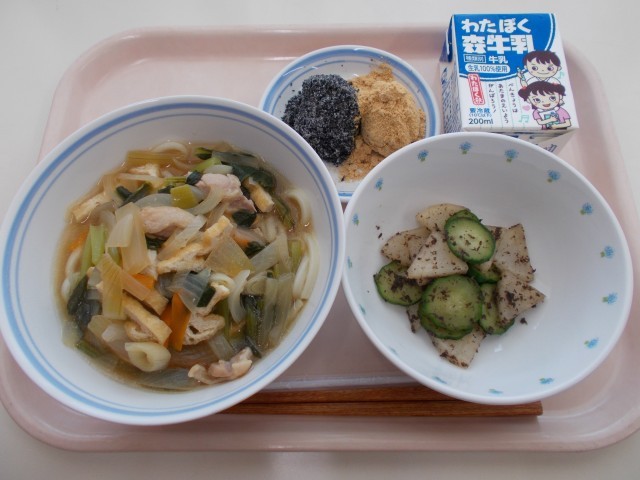鶏南蛮うどん 大根のゆかり和え 二色おはぎ 牛乳