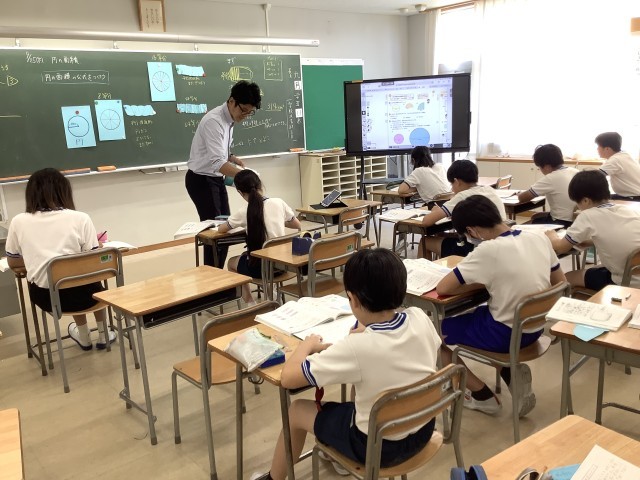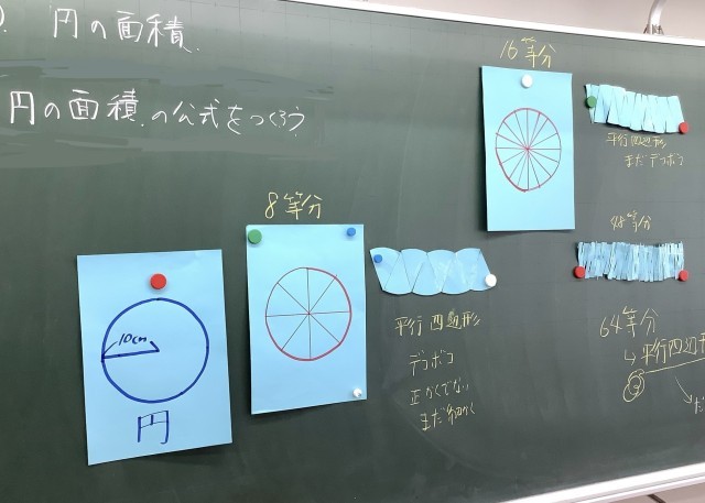 6年生は、算数「円の面積」の学習に取り組んでいます。今日は、円の面積の公式を導き出すために、実際に円を4等分、8等分、16等分、48等分、64等分に切って並びかえ、既習の図形に置き換えて考えていました。
