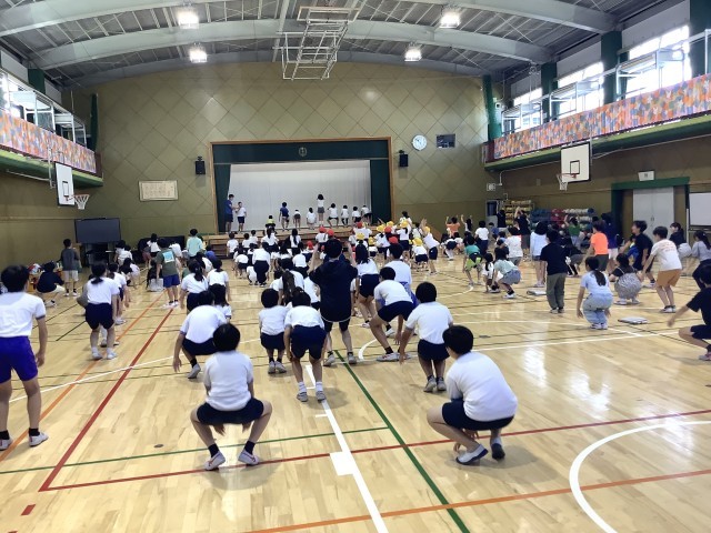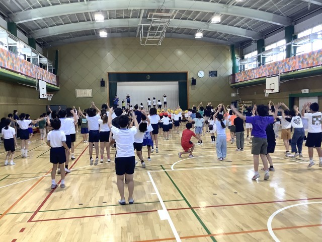 体育館で体育委員会主催の体育集会を行いました。今日は「言うこと一緒、やること一緒」というゲームをしました。体育委員会のリーダーが「右!」と言ったら右へジャンプし、「前!」と言ったら前へジャンプします。慣れてきたら「言うこと一緒、やること逆」というゲームに切り替えて、「右!」と言ったら左へジャンプ、「前!」と言ったら後ろへジャンプして身体を動かしてみんなで楽しみました。