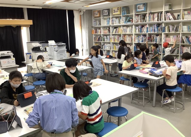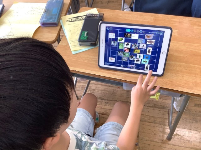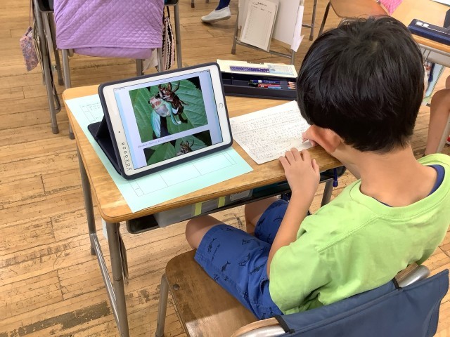 毎週金曜日の5校時は、自己選択学習の時間「のびっこタイム」です。各自が選んだ課題を探究する時間です。2年生も学習用情報端末iPadやメディアルームの図鑑を使って、自分の探究を進めています。