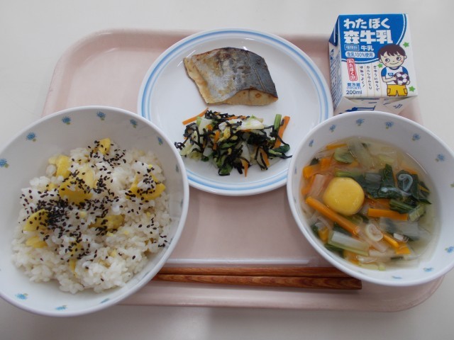 栗ごはん 魚の西京焼き のり和え お月見白玉汁 牛乳