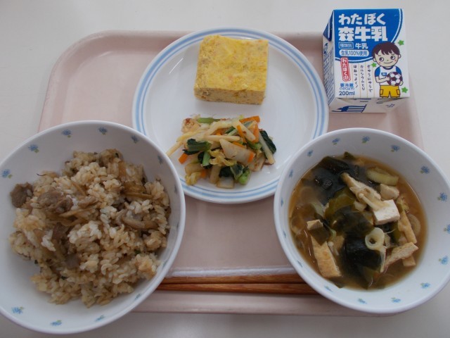 豚肉のしぐれ煮ごはん 千草焼き お浸し 豆腐とわかめのみそ汁 牛乳