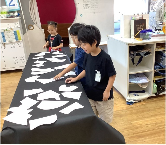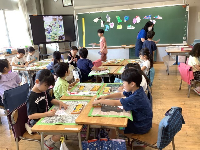 1年生は図画工作「いろいろなかたちのかみに」の学習をしました。白いいろいろな形の紙から表したいことを見付けて、楽しみながら工夫して絵に表しました。